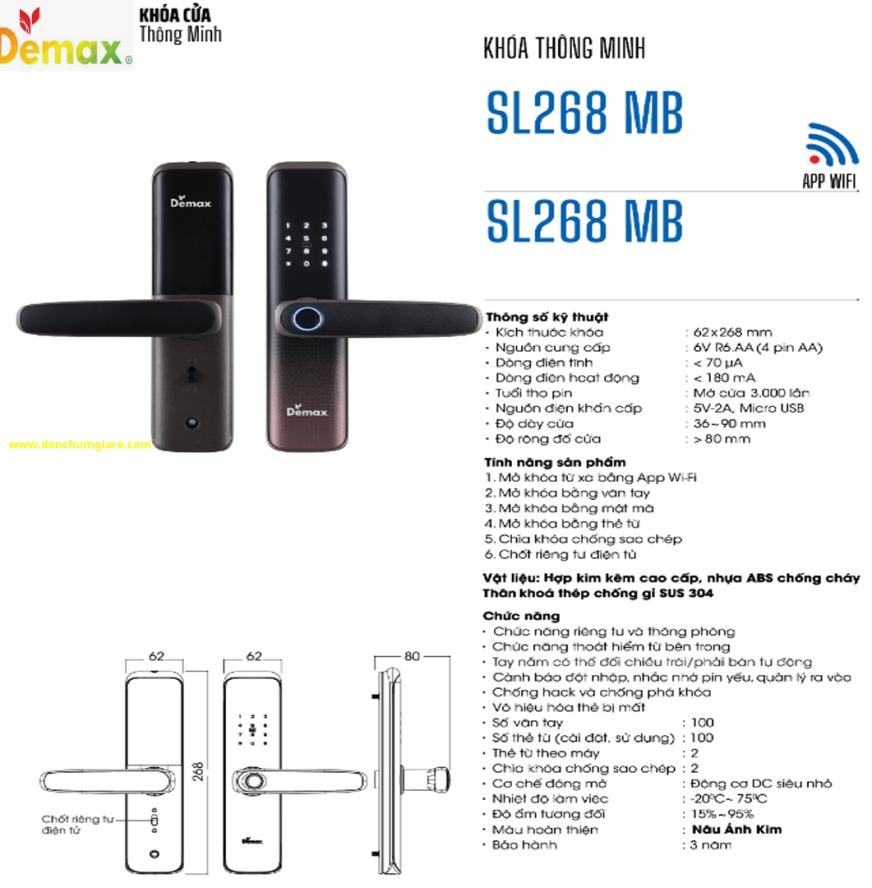 Khoá vân tay cửa gỗ Demax SL268 MB màu Nâu ánh kim tiêu chuẩn Đức với 6 tính năng nổi bật